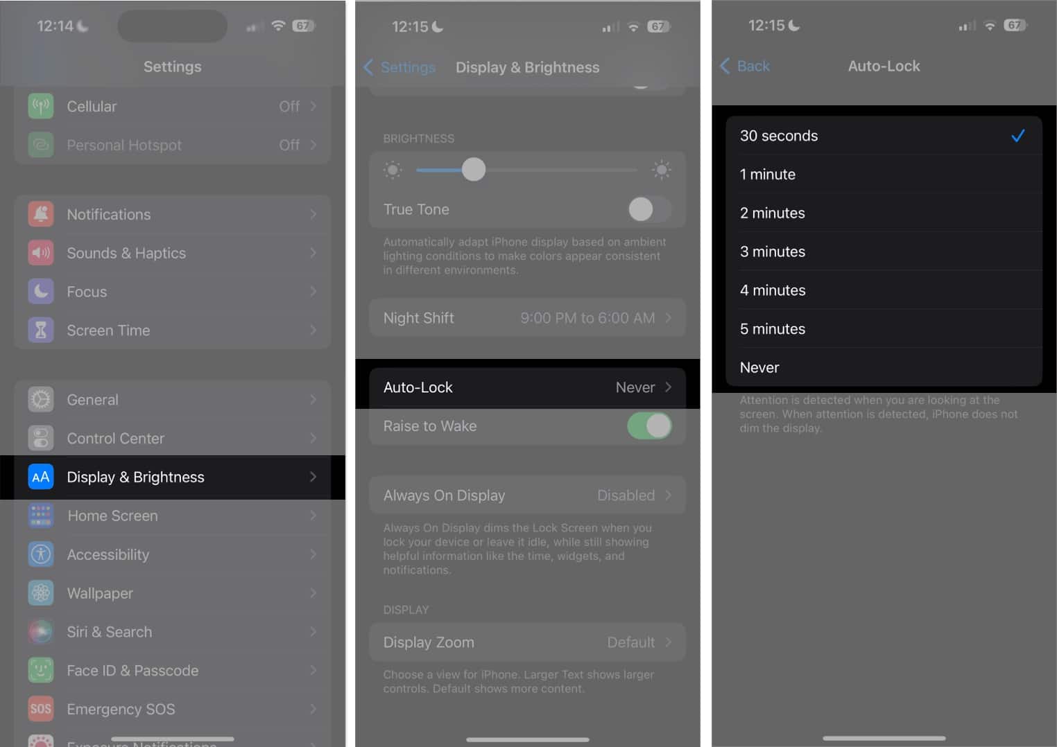 为此,请前往设置→显示与亮度→自动锁,然后选择您喜欢的时间间隔,但我建议您选择30秒。