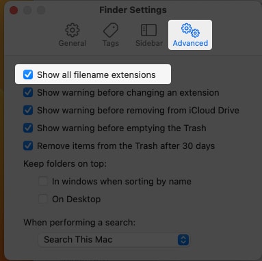 要获取文件扩展名,请访问发现者→偏好设置→先进的并启用“显示所有文件扩展名”选项。