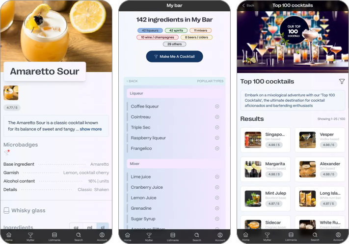 此外,如果您正在寻找鸡尾酒创意,您可以根据烈酒、类型等浏览不同的类别。其直观的界面使鸡尾酒混合成为一种有趣的方式来给您的客人留下深刻的印象或在家中享受节日饮品。