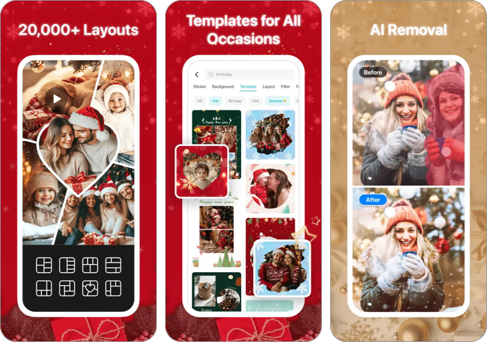 该应用程序还提供节日模板,以保持节日气氛。您可以添加贴纸、文本和滤镜,并与亲人分享您的拼贴画。此外,您还可以用它来制作圣诞贺卡。