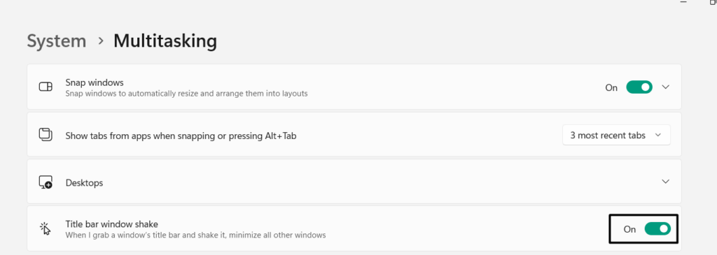 Windows 11 中默认未启用摇动最小化功能。您需要手动启用它,下面提到的步骤可以轻松解释这一点: