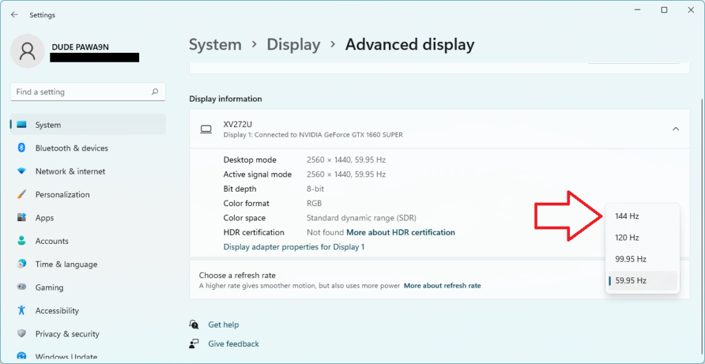3.旁边选择刷新率,单击下拉图标并选择提到的最高刷新率。