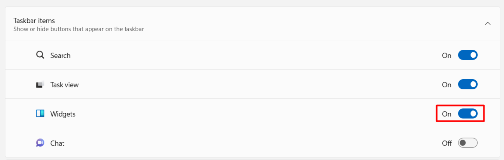 3.展开任务栏项目部分,并在同一部分中,打开小部件拨动开关。