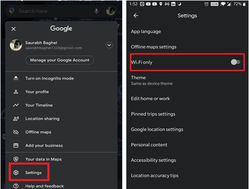 但是,仅Wi-Fily选项是减少数据使用量的好方法,它可以防止该应用在其范围内运行。当您打开此设置时,Google Maps将收集新的数据,直到您链接到Wi-Fi网络为止。如果您使用移动数据,则不会更新。要修复此Google地图在您的Android设备上无法解决问题的问题,只需禁用此选项即可。