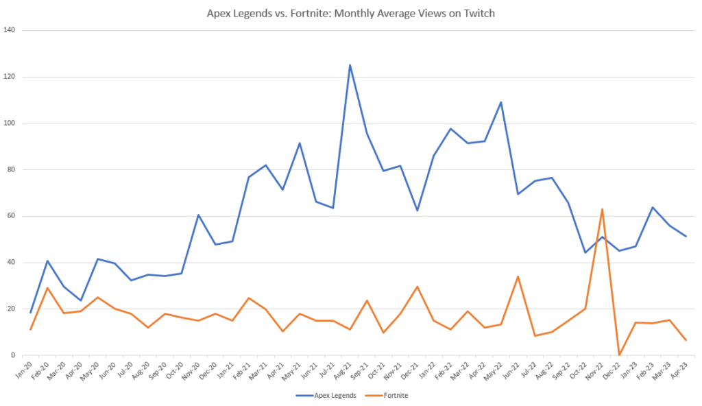 上图显示了过去三年平均每月观看次数的变化。我们可以看到,自 2020 年 1 月以来,Apex Legends 的内容平均观看次数超过了 Fortnite。