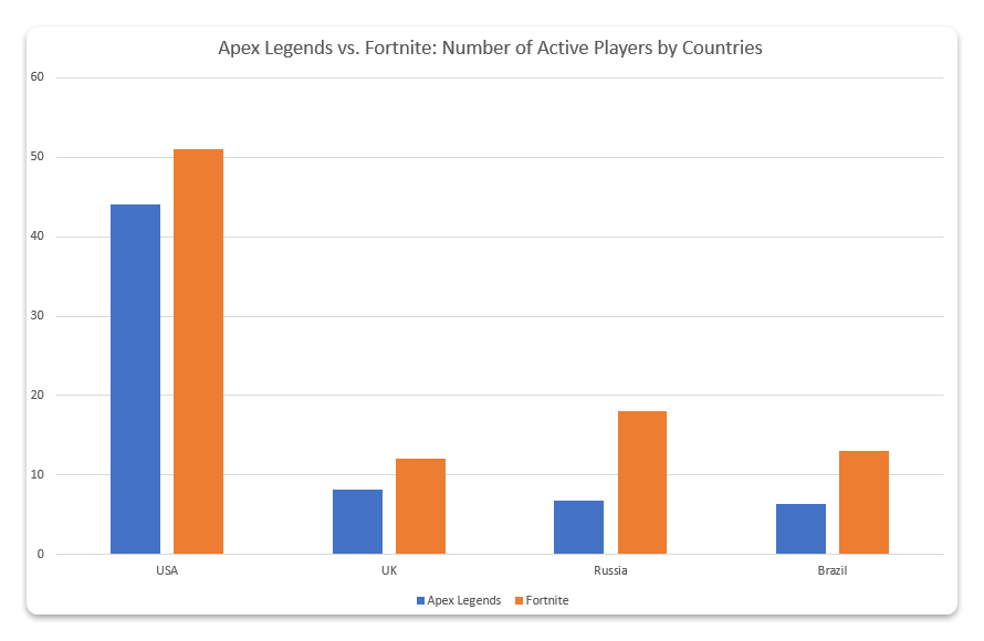 我们可以看到这两款游戏在美国都很受欢迎。 Apex 在该国的用户数量尤其接近《堡垒之夜》。因此,我们不知道《堡垒之夜》未来几年是否能在美国保持其地位。