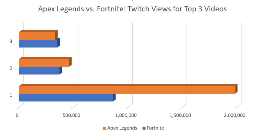 如果我们比较 Twitch 上与这两款大逃杀游戏相关的观看次数最多的前 3 条视频,我们可以看到以下数据: