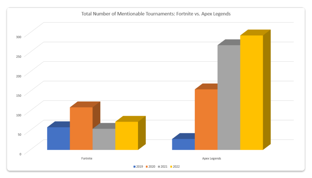 根据电子竞技排行榜,Apex 和 Fortnite 都有许多官方和非官方的比赛。下表显示了2019年至2022年这两场比赛的比赛数量。
