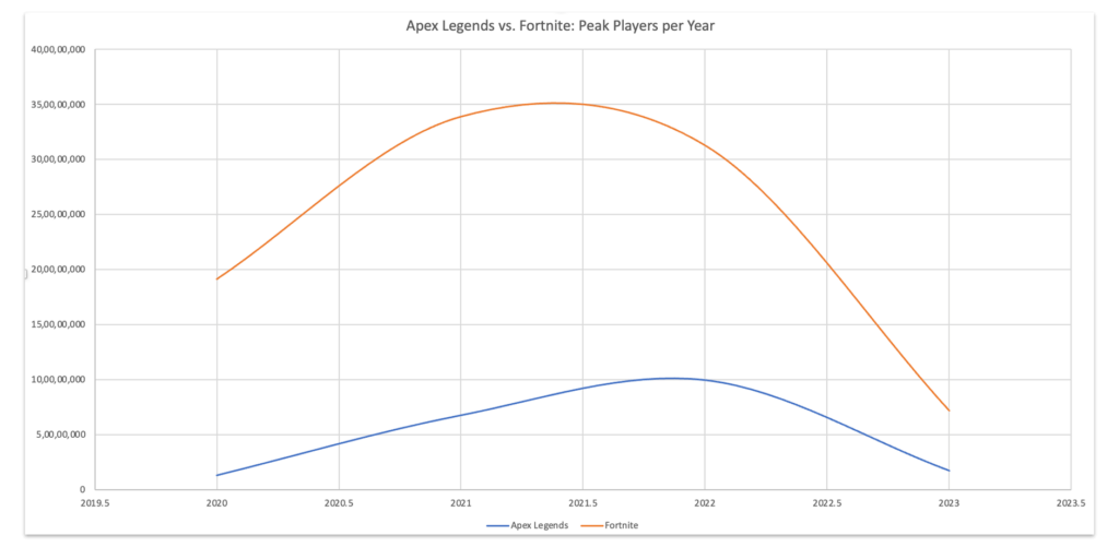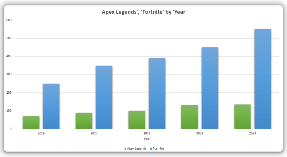 上述统计数据清楚地表明,如果排除2023年,《Apex英雄》的活跃巅峰玩家数量正在增加。但《堡垒之夜》的情况却恰恰相反。