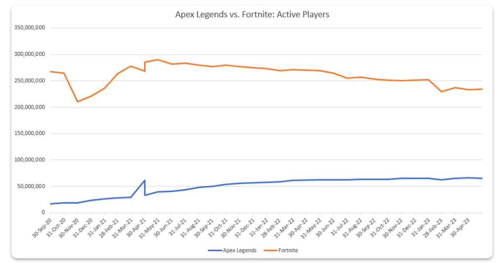 为了您的方便,我们提供了一个图表,让您可以清楚地了解《Apex Legends》和《堡垒之夜》的玩家总数(以百万计)。