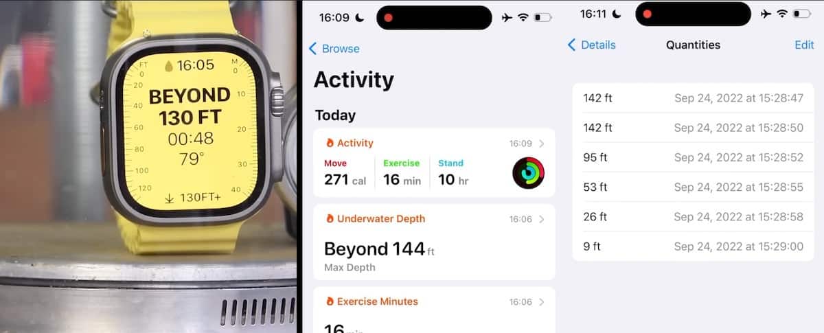 测试显示,Depth 应用程序将 UI 变成黄色,并显示“Beyond 130 FT”消息,但显示水温、潜水持续时间和当前时间。但是,会话结束后,应用程序会通知用户可以在配对 iPhone 上的“健康”应用程序中查看深度历史记录。