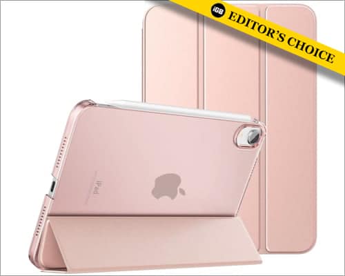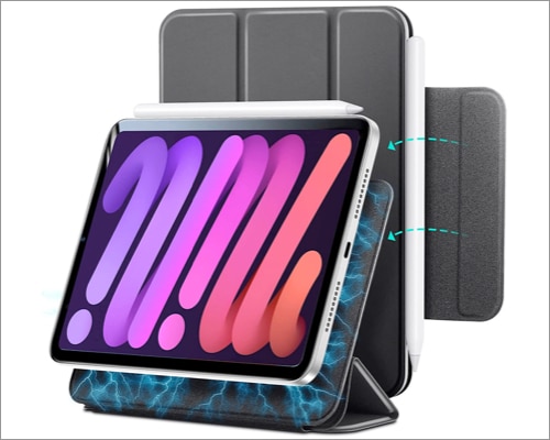 此外,MoKo Case Fit 采用耐用的 PU 外部皮革,内置磁条支持自动打开/关闭,从而延长电池寿命。