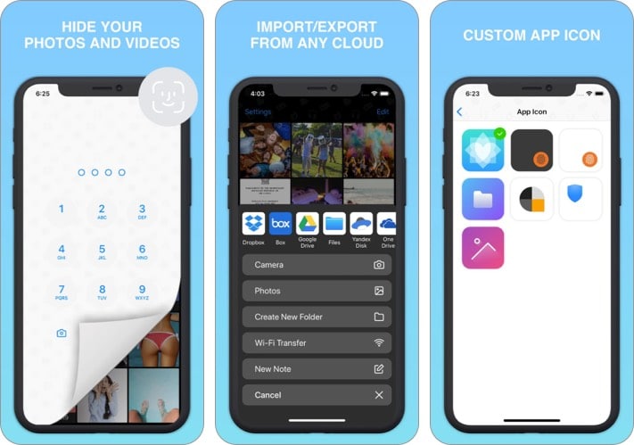 Safe Box 附带许多云选项来保护您的照片和视频,即 Dropbox、Google Drive、Disk、iCloud 和 Yandex。从这些云服务导出文件几乎不需要一分钟。该应用程序的多功能性在于其可定制性。不过,请选择应用程序图标来添加您的个性化风格。