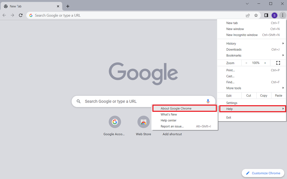 步骤 2 –点击帮助>关于谷歌浏览器