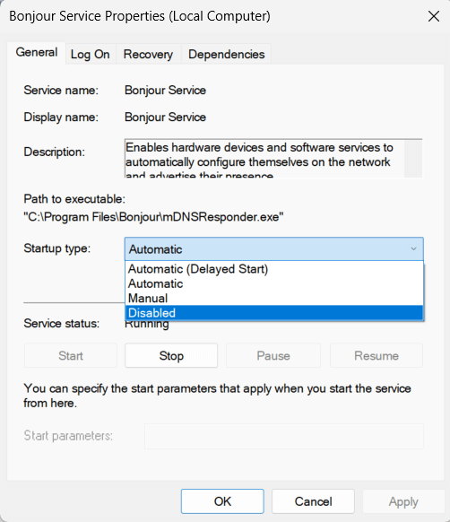 解决方案 8 – 禁用 Bonjour 服务