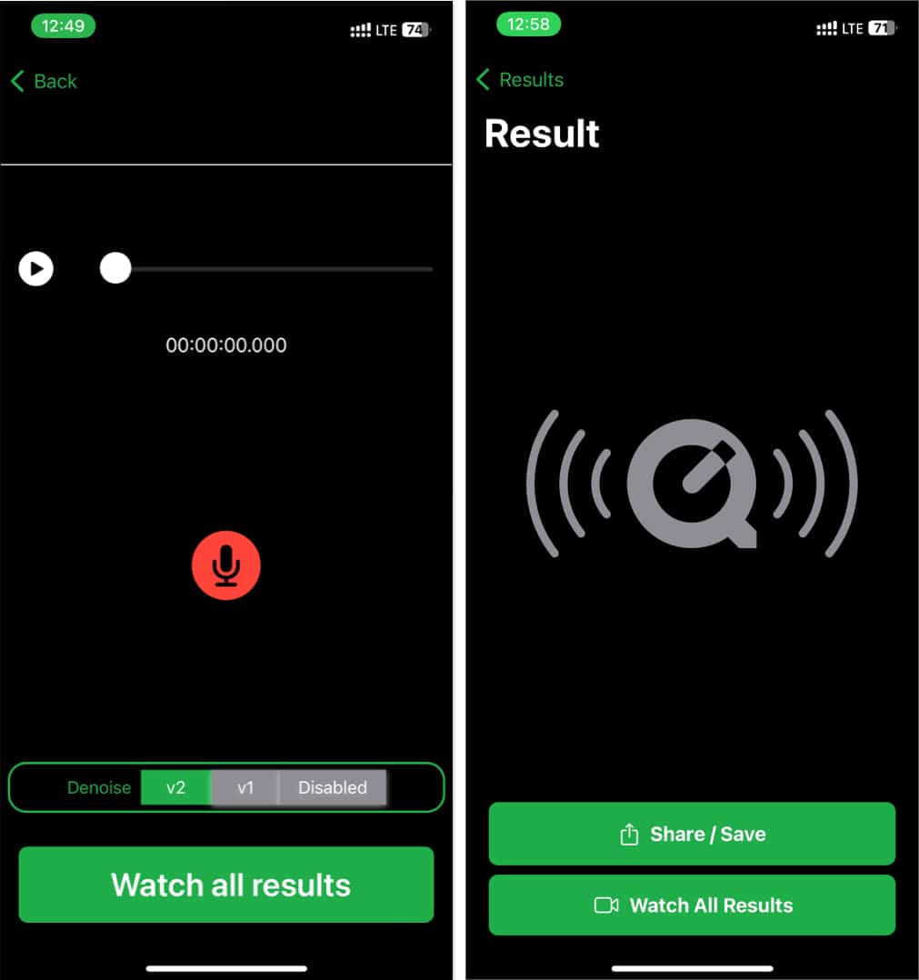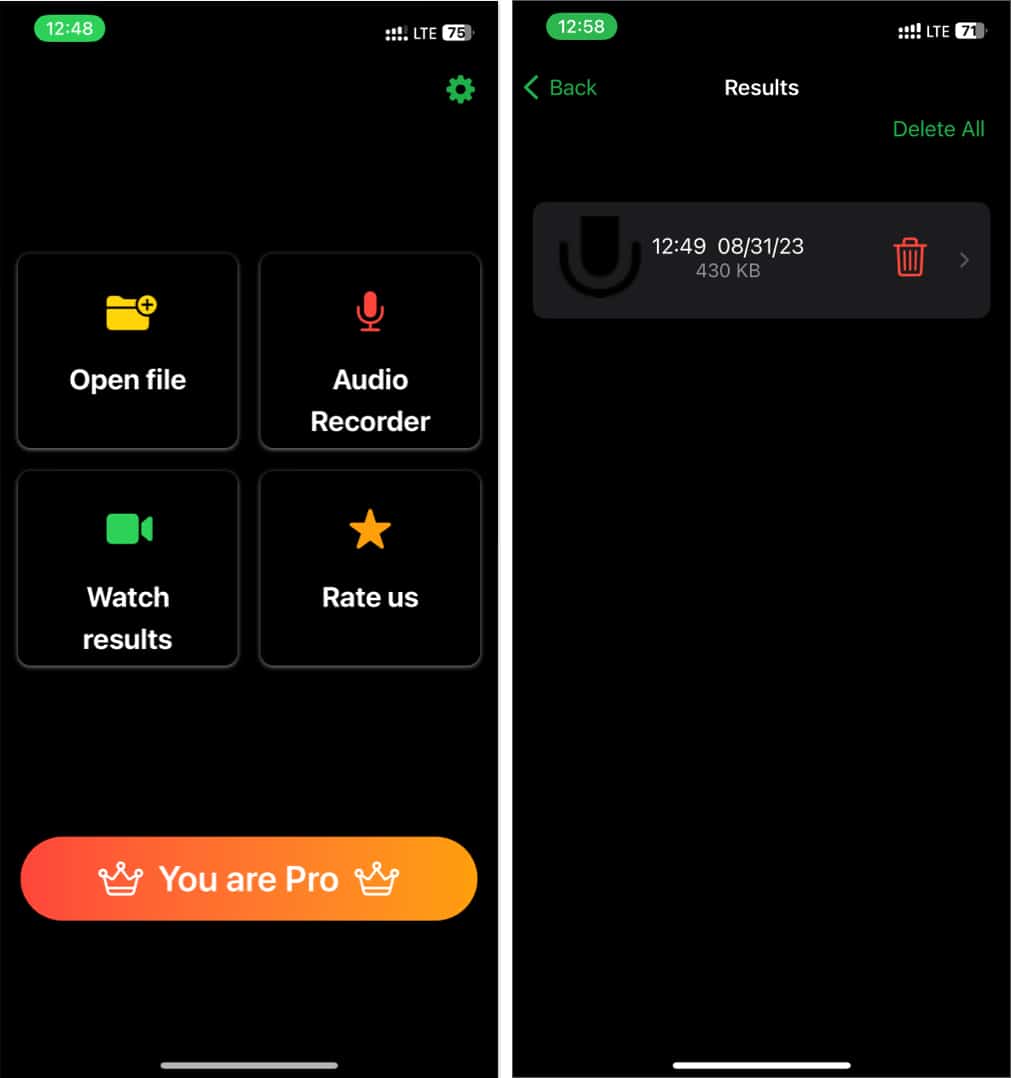 虽然“打开文件”和“给我们评分”选项是不言自明的,但“录音机”可让您在 iPhone 或 iPad 上录制音频,而“观看结果”选项则会向您显示过去录音的结果。