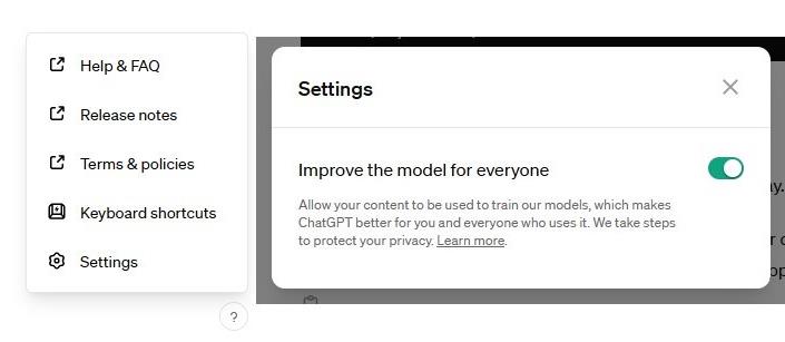 只需单击网页右下角的问号按钮,然后选择“设置”。切换“为每个人改进模型”选项。就是这样,您已选择退出训练 ChatGPT。