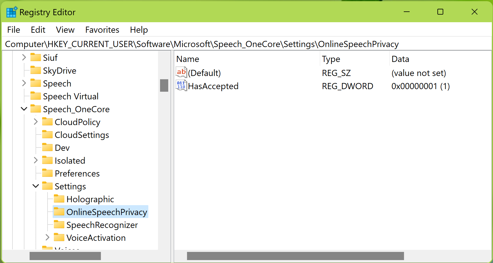 HKEY_CURRENT_USERSoftwareMicrosoftSpeech_OneCoreSettingsOnlineSpeechPrivacy