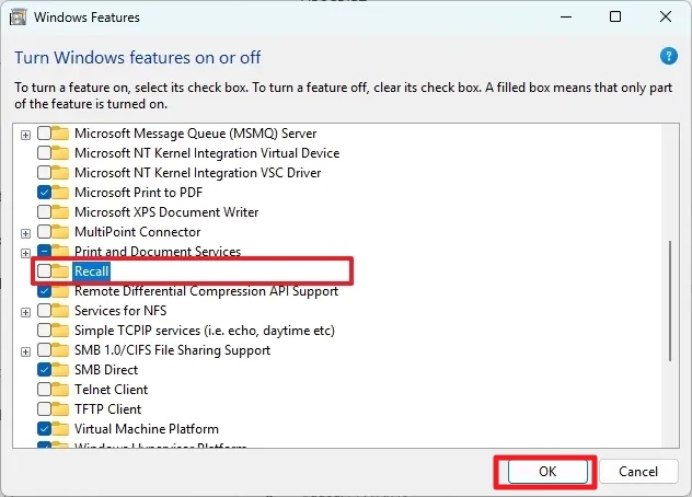 如果您想重新启用“调用”功能,您只需打开“Windows 功能”窗口,选中“记起”选项,然后单击“好的”。