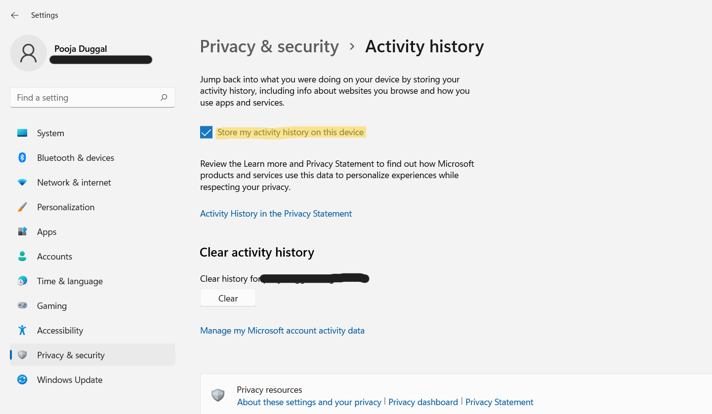 3.现在,您将遇到在此设备上存储我的活动历史记录选项。