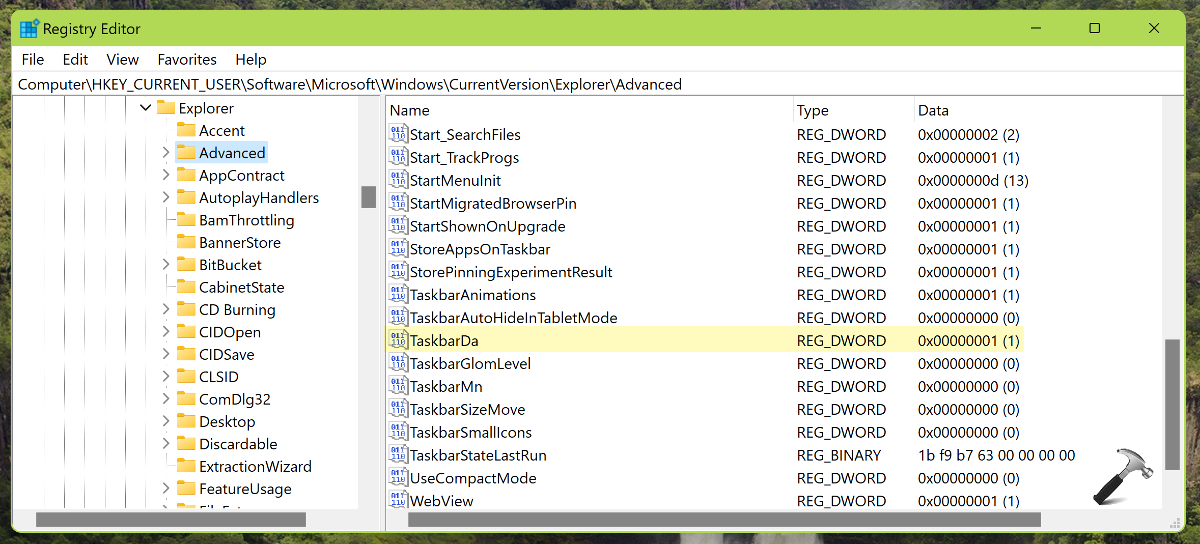 3. 在“高级”注册表项的右窗格中,找到名为的注册表 DWORD任务栏达。默认情况下,此注册表 DWORD 的值数据设置为 1,这意味着小部件已启用。要禁用小部件,只需双击此 DWORD 值并将其值数据设置为 0。