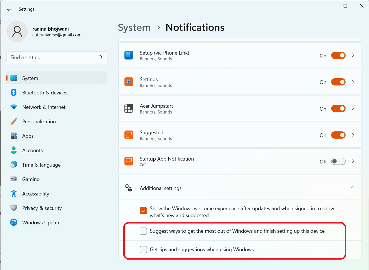 后藤设置>系统>通知> 向下滚动并单击附加设置。取消选中充分利用 Windows 的建议方法和完成此设备的设置并获取使用 Windows 选项时的提示和建议。重新启动计算机以进行更改。