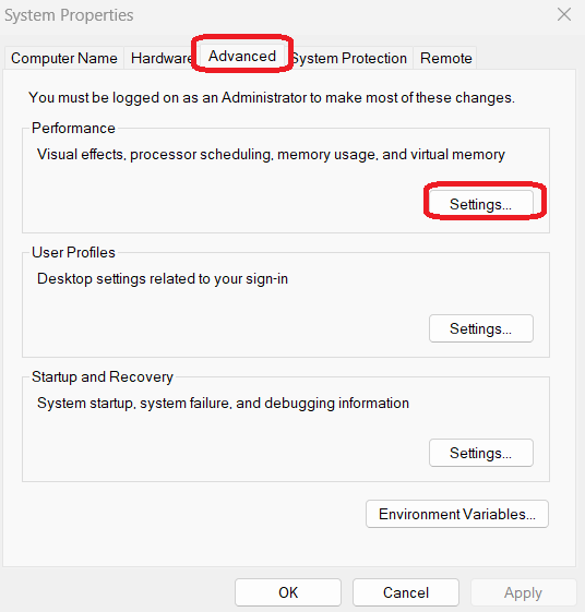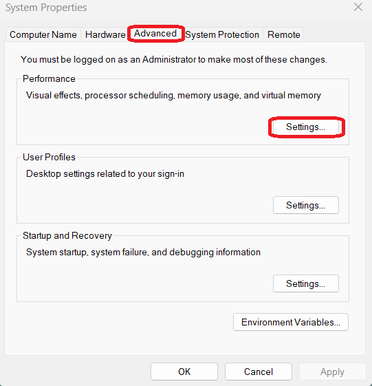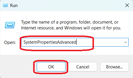 前往开始按钮。接下来,单击跑步。在运行提示中写入系统属性高级然后单击好的。