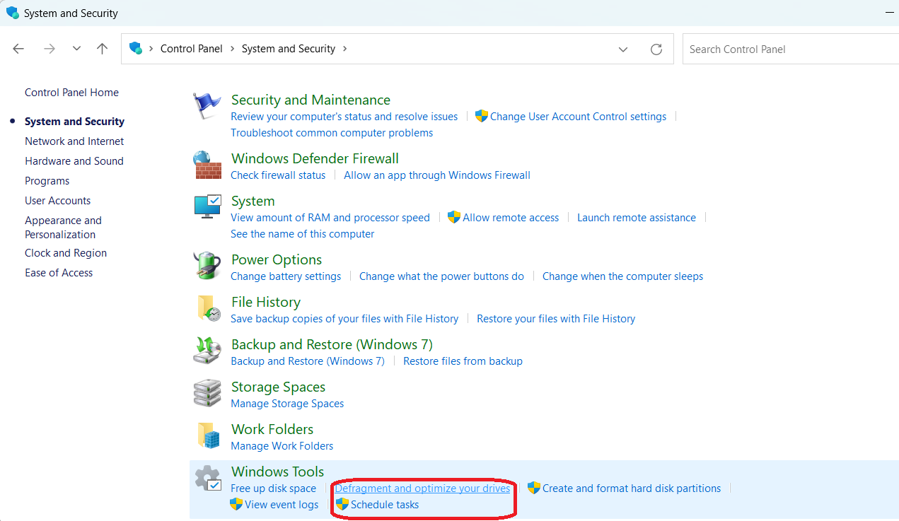 打开控制面板。点击系统与安全。然后在 Windows 工具中单击对驱动器进行碎片整理和优化.