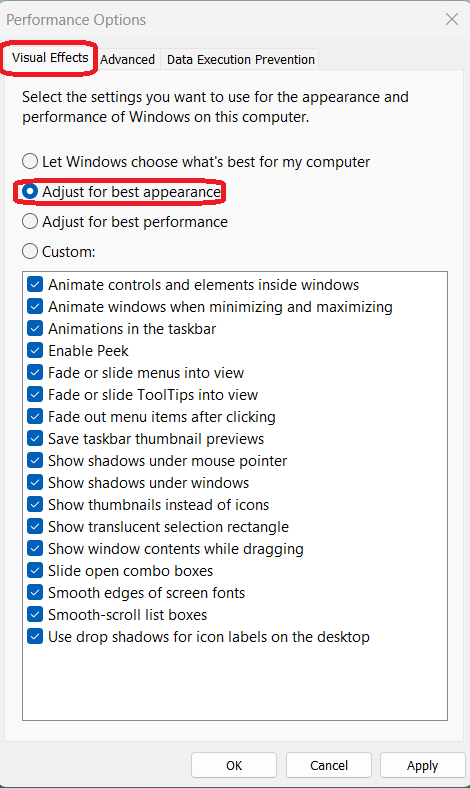 修复 3:为了获得良好的 CPU 性能设置视觉效果