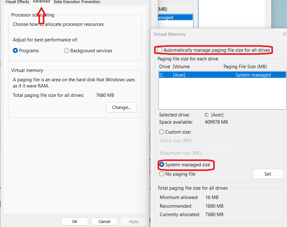 轻敲高级选项卡>改变> 取消选中自动管理所有驱动器的分页文件大小>系统管理的大小>好的.