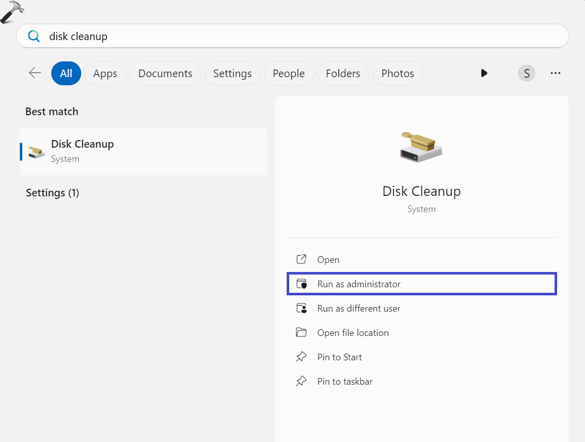 1. 打开搜索栏并输入“磁盘清理”。单击“以管理员身份运行“ 选项。