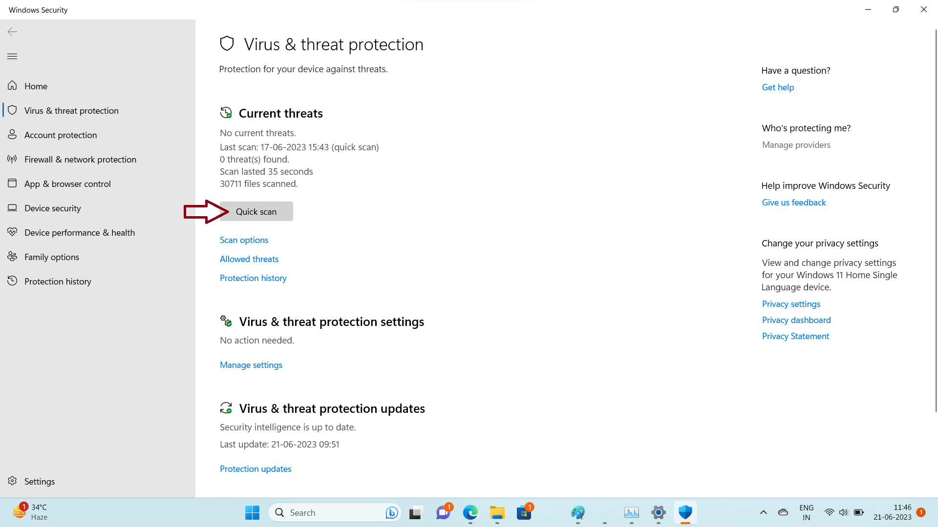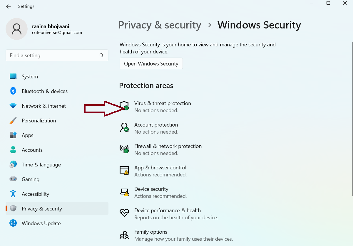 2. 单击“隐私和安全”>,然后单击“Windows 安全”。