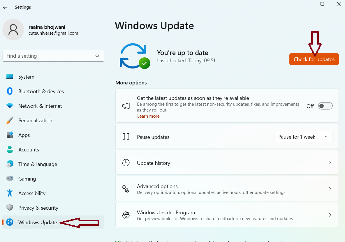 2. 单击“Windows 更新”>“检查更新”。