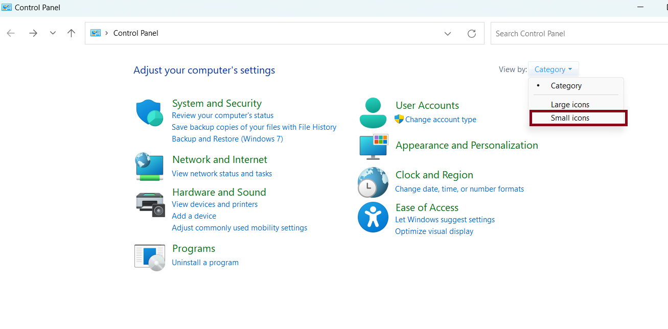 2. 单击类别并选择“小图标”。