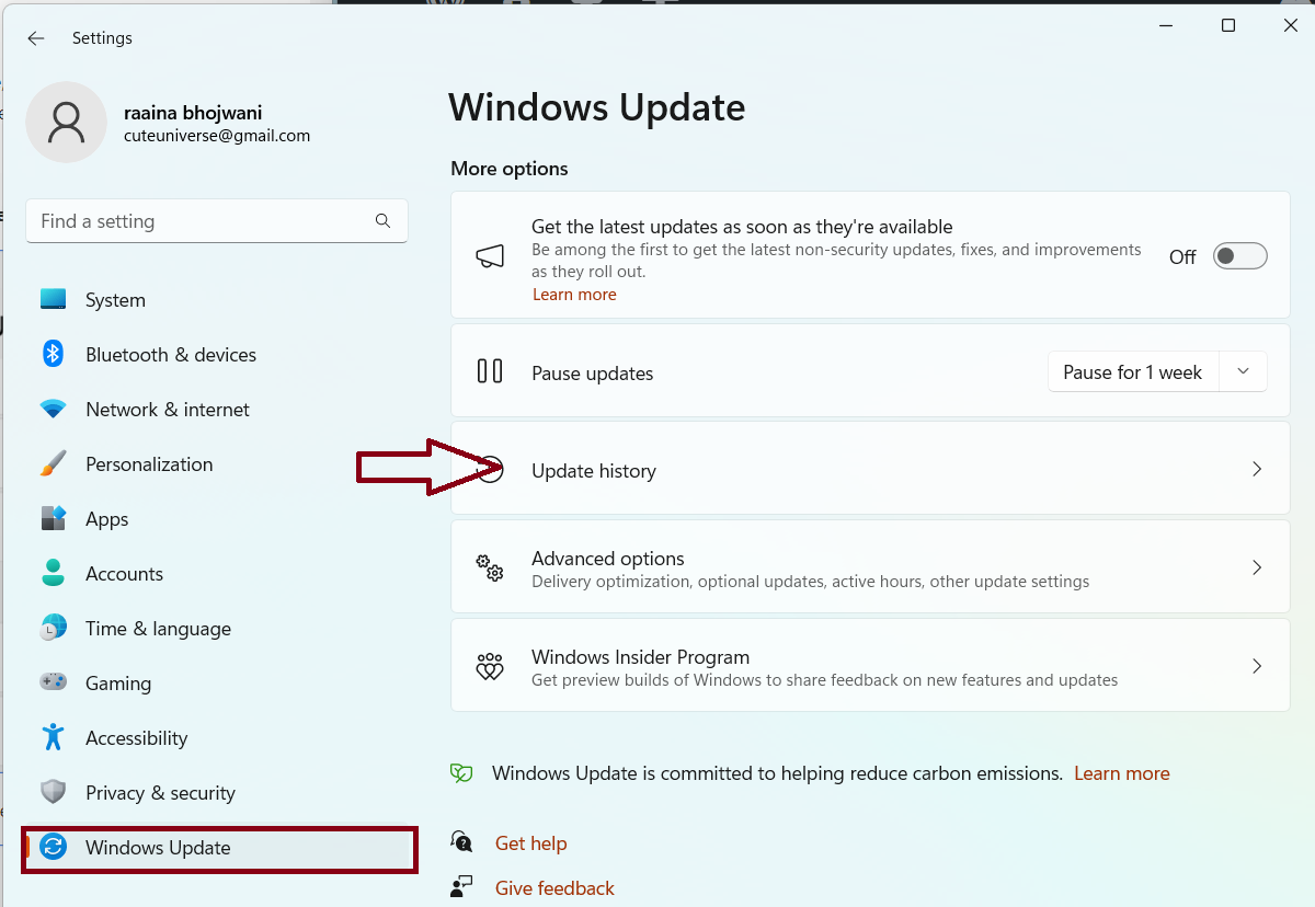 2. 单击“Windows 更新”> 然后单击“更新历史记录”。