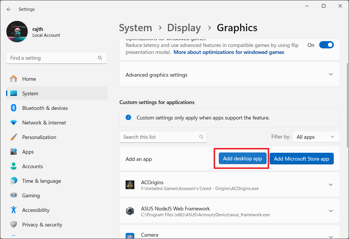 3. 在应用程序的自定义设置下,单击“添加桌面应用程序“ 按钮。