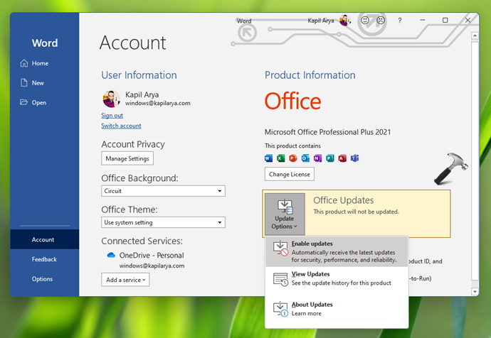 在这种情况下,当您转到已安装的任何 Microsoft Office 应用程序的“帐户”页面时,您将看到该产品不会更新在 Office 更新下。这可以在下面的屏幕截图中看到。