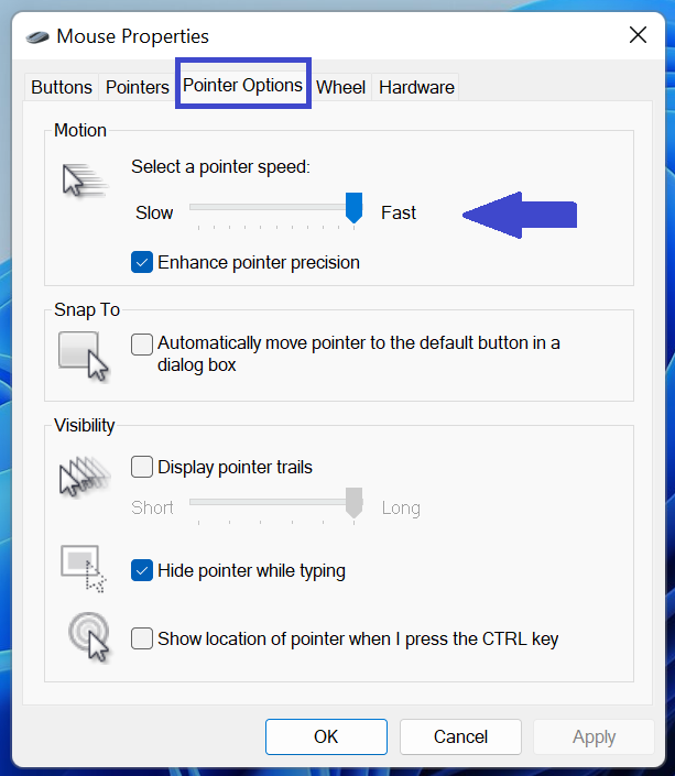 步骤3:转到“指针选项”选项卡。