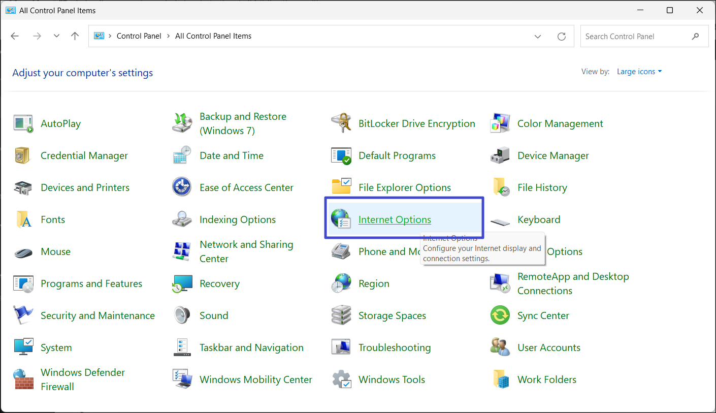 2. 将控制设置视图更改为大图标并点击“互联网选项”。