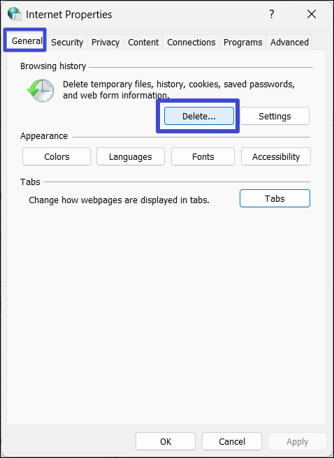 3. 在“Internet 选项”窗口中,切换到一般的选项卡并单击“删除…”在浏览历史记录部分下。