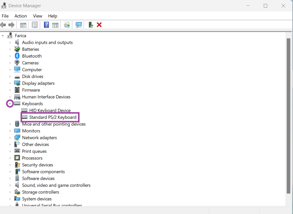 - 然后,点击小键盘箭头将其展开,然后右键单击标准 PS/2 键盘。