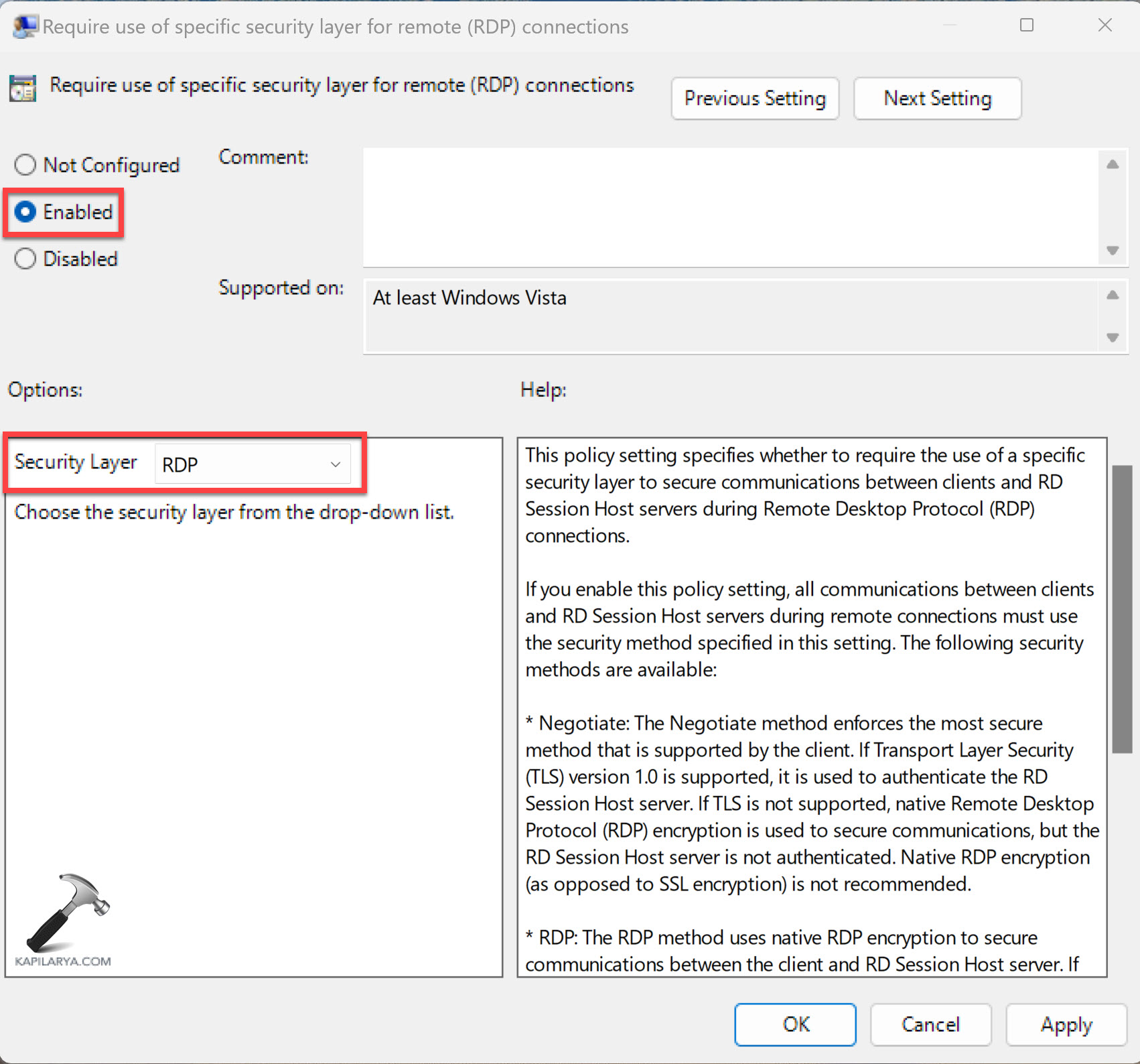 4. 将策略设置为“启用”。在“安全层”中,选择“RDP”。点击“应用”和“确定”。