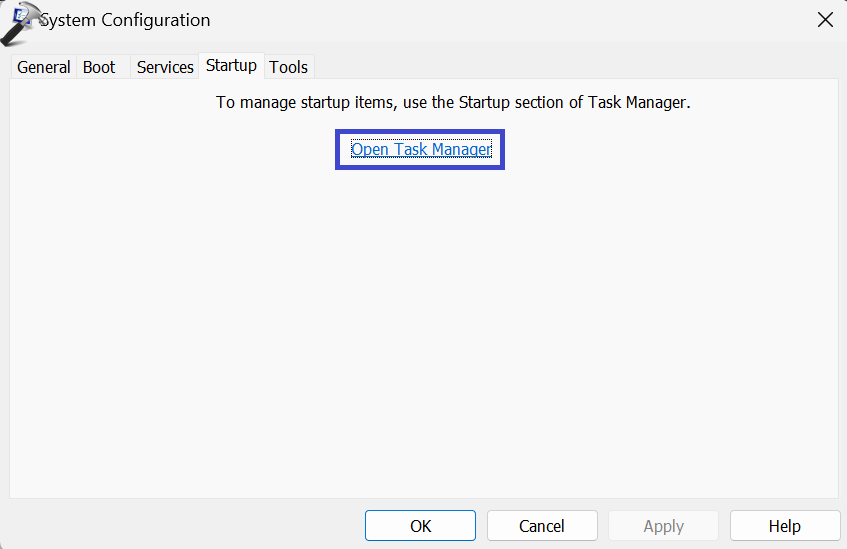 3. 现在,在“启动”选项卡下,单击“打开任务管理器”。