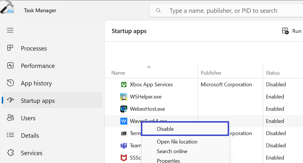4. 将所有项目一一禁用。要禁用它,请右键单击它,然后选择“禁用“ 选项。