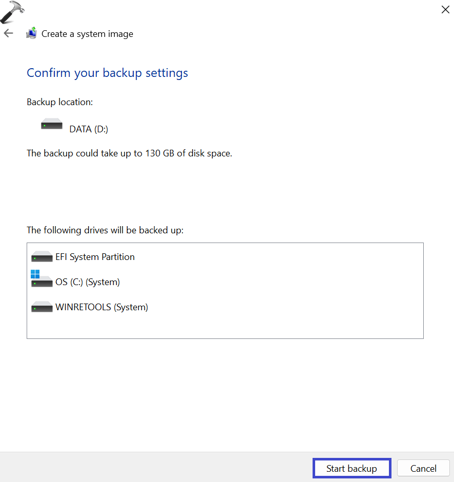 5. 单击“开始备份”来启动备份过程,Windows 将根据您的选择创建完整的系统映像。