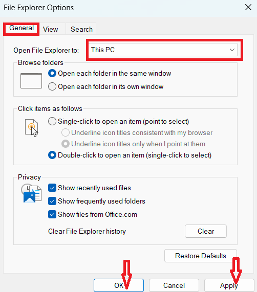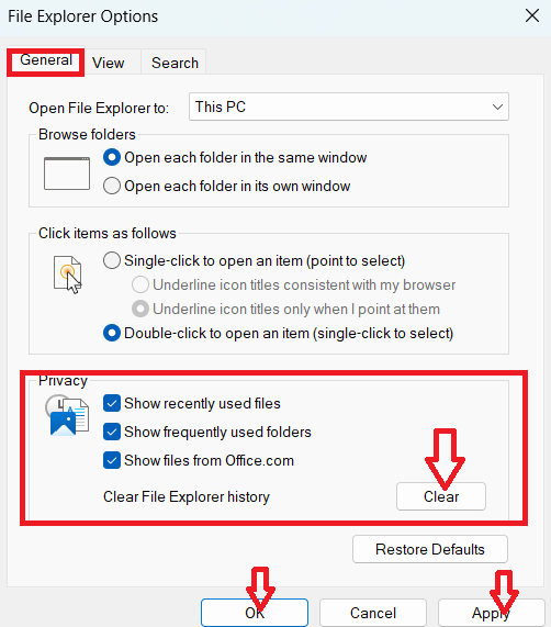- 选择一般的选项卡并转至隐私部分。然后点击清除>申请>好的。