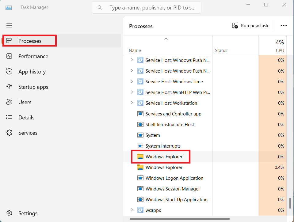 修复 3:从任务管理器重新启动 Windows 资源管理器