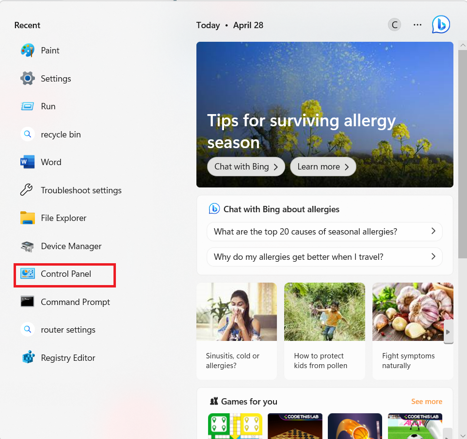 - 按窗口+Q键一起并打开控制面板与我们在之前的修复中所做的相同。