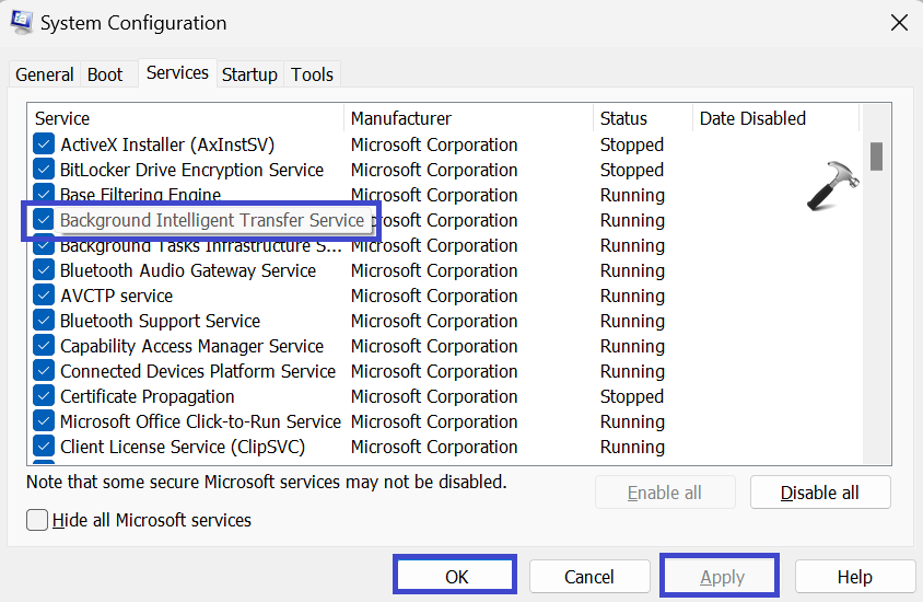 2. 根据服务选项卡,取消选中“后台智能传输服务“ 盒子。