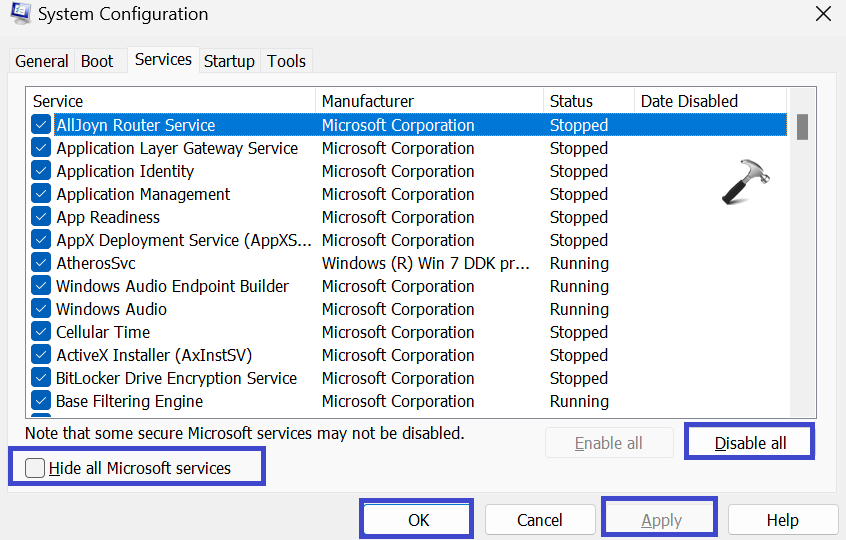 2. 在“服务”选项卡下,取消选中“隐藏所有 Microsoft 服务“ 盒子。